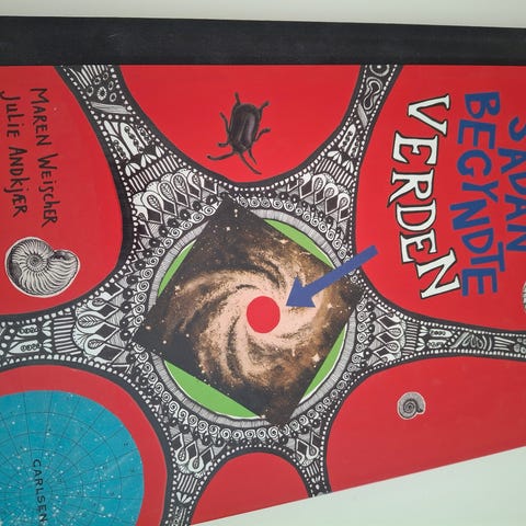 Bog med titlen 'Sådan begyndte verden' af Maren Uthaug og Julia Rahbek. Bogen har en rød forside med illustrationer og tekst på dansk.