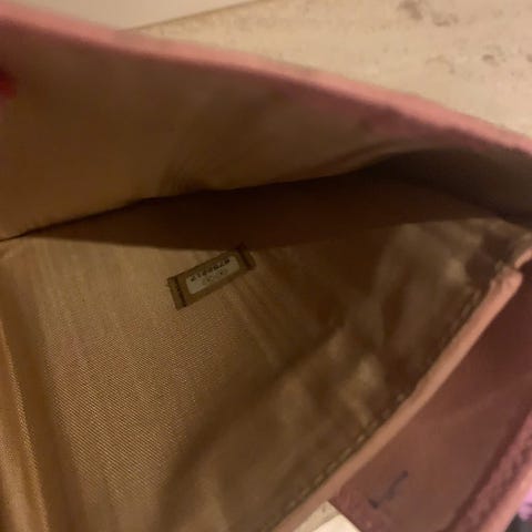 Chanel læder pung til kvinder. Pungen er fremstillet i læder og har flere kortlommer samt en møntlomme med klap. Indvendigt foret med stof med Chanel-logo. Farven er lyserød med guldlogo på ydersiden.