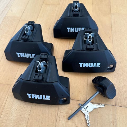 Thule Evo Flush Rail tagbøjler leveres med tilbehør til montering på flugtskinner. Sættet indeholder to tagbøjler og monteringsdele, designet til at passe biler med flugtskinner.