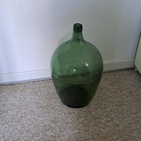 Grøn glasflaske med stor størrelse og dekorativt design. Egnet til brug som pynt eller opbevaring. Fremstillet af glas med en rund form og smal hals.