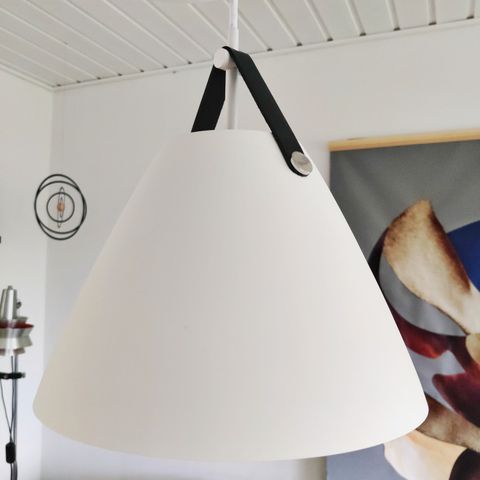 "Strap-serien, designet af Bjørn + Balle for Design For The People (DFTP), kombinerer et enkelt og stilrent design med et nordisk udtryk. Denne hvide pendel er et perfekt eksempel på seriens æstetik, hvor minimalistisk design møder varme og rå læderdetaljer. Lampens karakteristiske læderrem tilføjer et unikt og personligt touch.