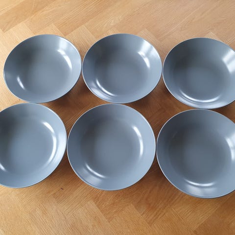 9 dybe tallerkener i stentøj med silkemat glasur. Farven er mørkegrå / gråblå. Den er mørkegrå i dagslys og bliver gråblå i mørke rum. Jeg ved ikke hvem producenten er.