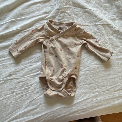 H&M slå-om-body til piger i størrelse 50. Bodyen er beige og lavet af bomuld. Den har lange ærmer og knapper i bunden og langs siden for nem påklædning. (2)