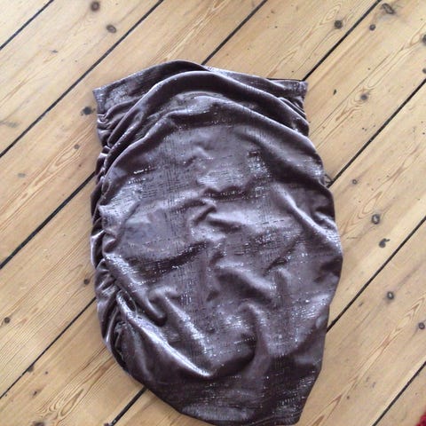 Lukkes med et bånd om halsen. Mærket med er klippet af. Vaske mrk sidder stadig i.