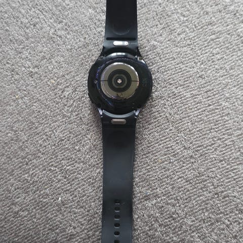 Samsung Galaxy Watch 7 fra d 17-6-25 med kvittering smartwatch med rund urskive og grøn rem. Uret har digital skærm med mulighed for forskellige urskiver. Designet til at blive brugt som et smartur til daglig brug og fitness tracking.