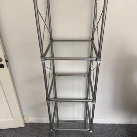 2 flot metal reoler. stykke pris kr. 850. 2 metal hylder (38X38 cm) , 1 glas hylde 38X38 cm, 1 glas hylde 35 cm, 3 glas hylder 38X 8cm .