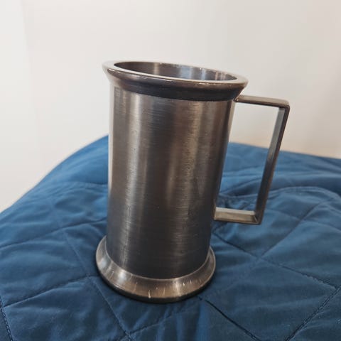To krus i tin, den ene med hank og den anden med hank og en ske. Materialet er tin, og de har en klassisk, rustik udseende.