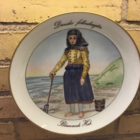 Ukendt blå platte dia 34,5 cm med motiv af indkørsel til en by