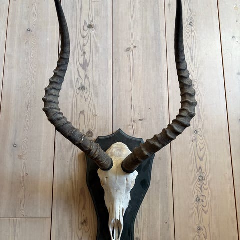 Gevir med kranie monteret på en sort træplade. Naturligt materiale, velegnet til dekoration eller samling.