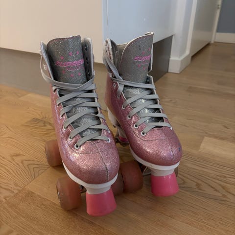 Mad Gear rulleskøjter i størrelse 40 med holografisk overflade. Skøjterne er designet til børn og har fire hjul på hver skøjte.