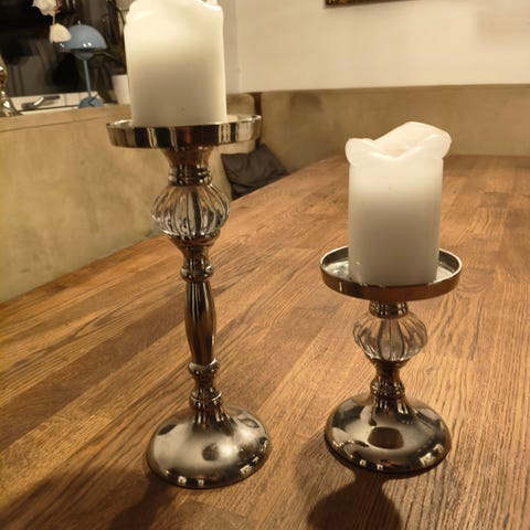 To sølvlysestager fra Lene Bjerre til kronelys. Aldrig brugt, i original emballage. Højde: 24 cm. De er aldrig brugt, men trænger til at blive pudset især den ene.