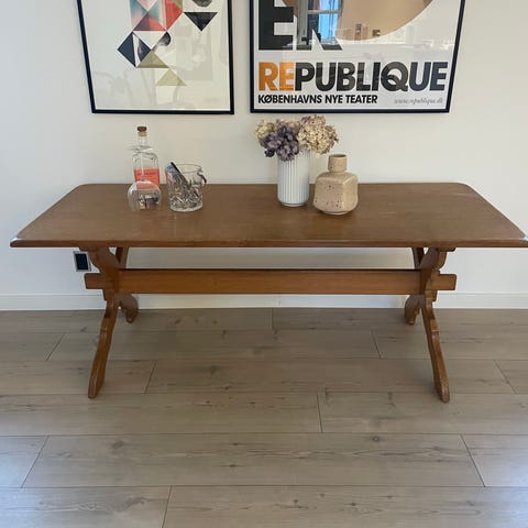 100% massivt egetræ, som har et par ringe i træet, men som let kan få en slibning og stå super flot igen.