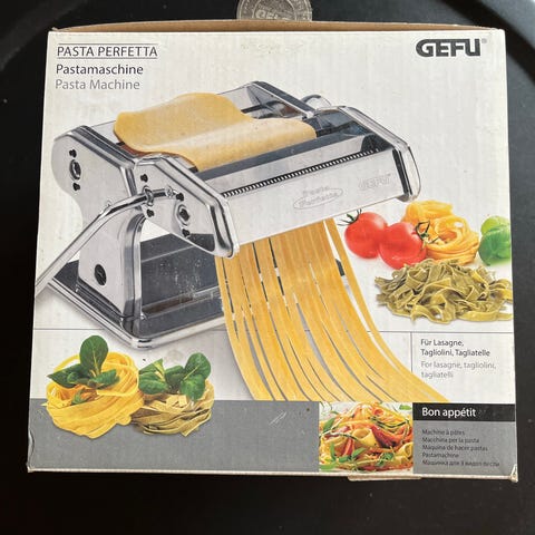 GEFU Pastamaskine i rustfrit stål med blå detaljer. Maskinen er designet til at lave frisk pasta med justerbare tykkelsesindstillinger og en håndsvingmekanisme. Velegnet til lækker hjemmelavet pasta. Æske plomberet og derfor helt ny og ubrugt. Kan sendes.