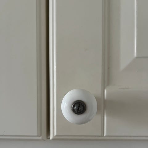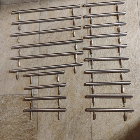 IKEA køkkenhåndtag med hvidt håndtag og metalender. Designet til montering på køkkenskabe eller skuffer.