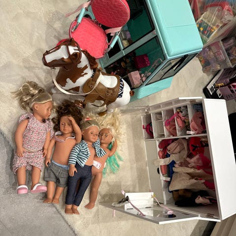 Our Generation klædeskab, 3 dukker, frisørstol samt diverse tilbehør i form af tøj, sko, frisørting, skoleting og spating sælges. Alt er i fin stand.