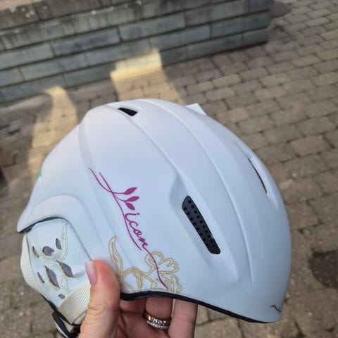 Flot hjelm. Str S/M 52-57 cm. Vejer ca 470 gram. Lidt smuds/snavs på kassens top, men betyder intet for hjelmen
