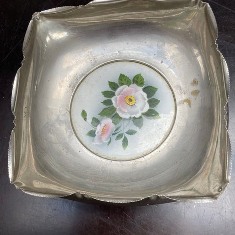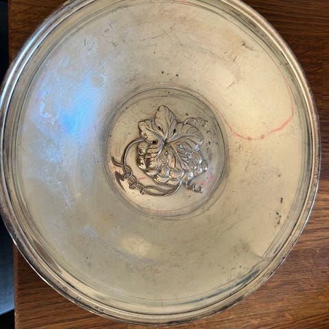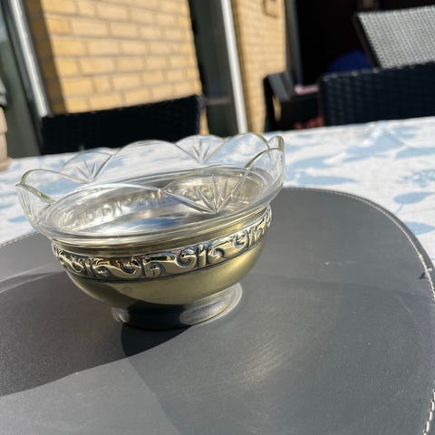 Antik sølvskål med håndtag, udformet med åbent mønster og dekorative detaljer. Skålen har en oval form og står på tre fødder med ornamentik. Egnet til dekoration eller opbevaring af små genstande.