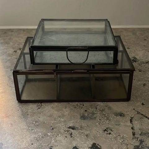 Gl smykkeskrin skrinet ind holder perler 60kr.