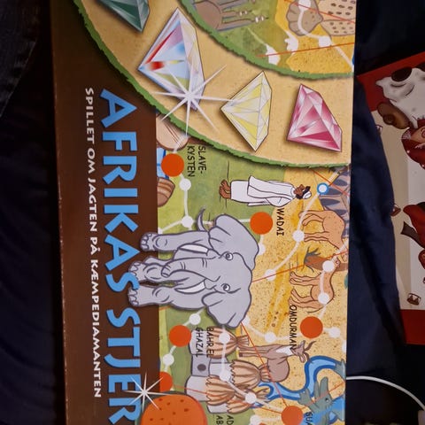 Den Forsvunne Diamanten brætspil med farverigt kortmotiv. Spillet indeholder et kort over Afrika med forskellige symboler og figurer. Egnet til familiespil og underholdning.
