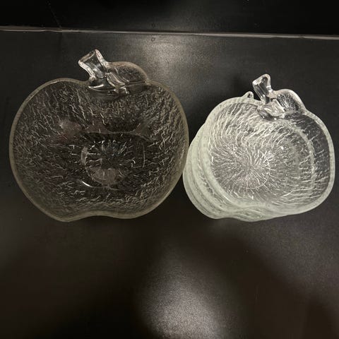 8 stk gamle Iittala glas dessertskål med mønstret design. Skålen har en fod og er fremstillet i klart glas. Velegnet til servering af desserter eller som dekorativt element.