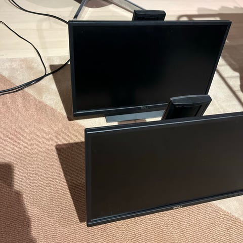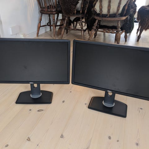 Dell skærme med fuld HD opløsning. Se model på mærkat på billede 3. Skærmen har et ergonomisk design med justerbar stander for optimal arbejdsstilling.