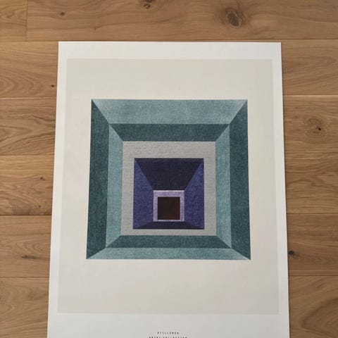 Kunsttryk med motiv af stilleben, der viser en kurv med frugt og en kniv. Trykket er udført i nuancer af gul og sort. Signeret og nummereret i bunden.