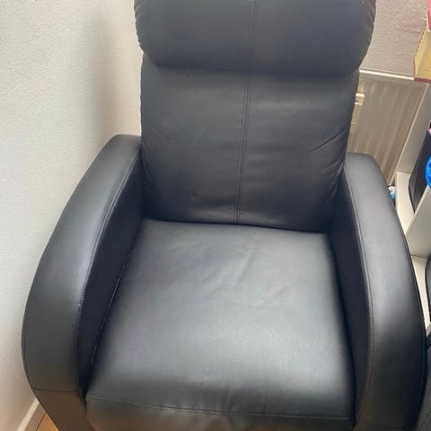 Sort læder lænestol med polstret ryglæn og armlæn. Inkluderer fjernbetjening til justering. Læderet viser tegn på slid på armlænet.