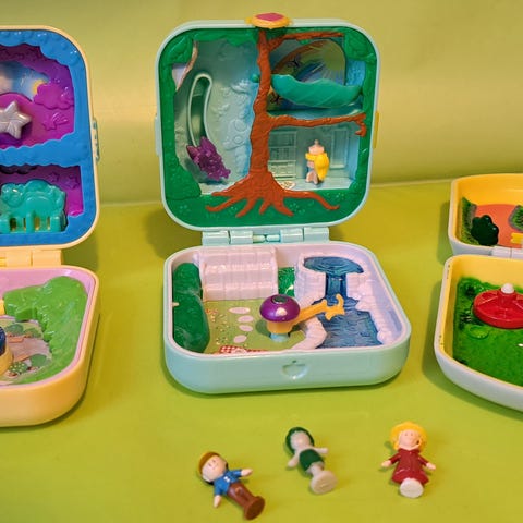 Stor retro by fra Polly Pocket m masser af udstyr, alt på billederne medfølger. Der er to skuffer bagerst t opbevaring.