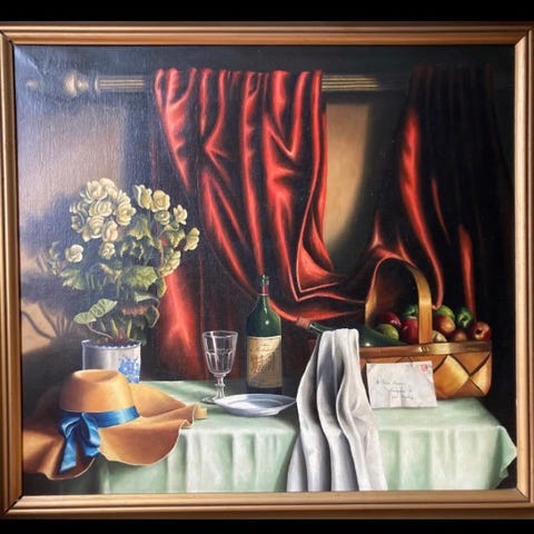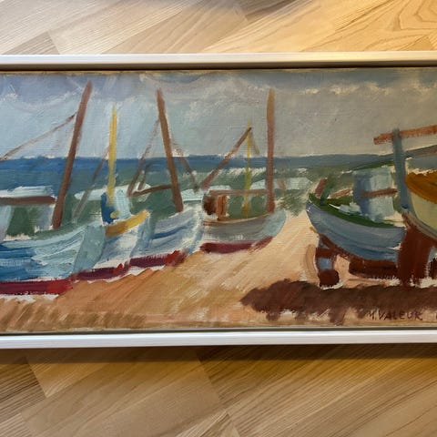 K. Valfur olie maleri med motiv af stilleben, der viser en skål med frugt, en flaske og flere løg. Maleriet er udført på lærred og indrammet. Signeret af kunstneren K. Valfur og dateret 80'erne.