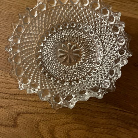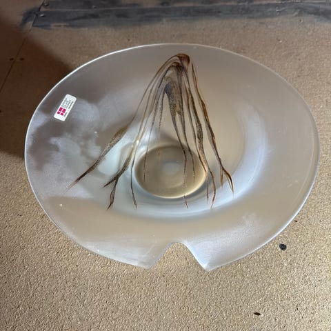 Glasfad med en rund form og en dekorativ blå og hvid detalje. Fadet er transparent med et bølget mønster på overfladen. Velegnet til servering eller som dekorativt elemen