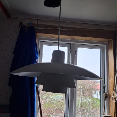 To yderst velholdte PH-lampe lignende blå pendeller med nye hvide stofledninger, som passer perfekt over spisebordet. Ukendt design, købt i DK.