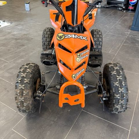 Mini ATV 50cc børnequad med sort og hvid farve. Designet til børn med robust stel og brede dæk for stabilitet. Udstyret med for- og bagaffjedring for komfortabel kørsel på forskellige underlag. Brugt få gange men har stået stille længe starter og kører