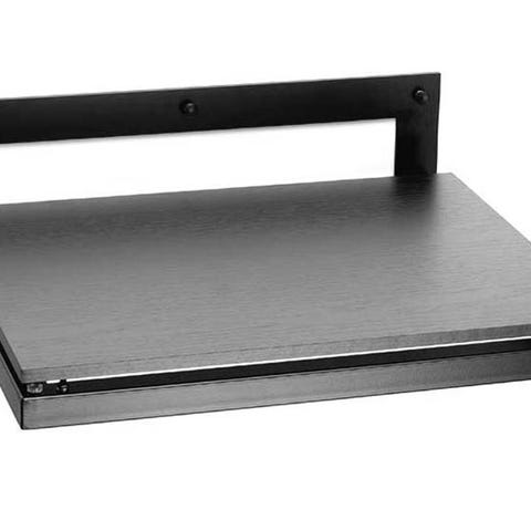 Stilrent ophæng til pladespillere. Selve konstruktionen er udført i stål og de justerbare spikes sørger for at træpladen er afkoblet og i vater.