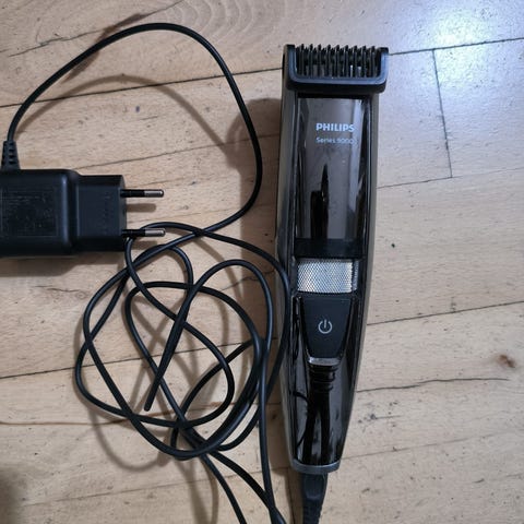 Philips Philishave hårtrimmer med justerbar kam, ledning til strømforsyning, og en grå/sort farve. Designet til brug ved hårklipning.