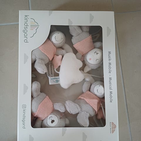 Uro til tremmeseng med musik. Der er to køer og et får med, selvom der kun er én ko på billedet.