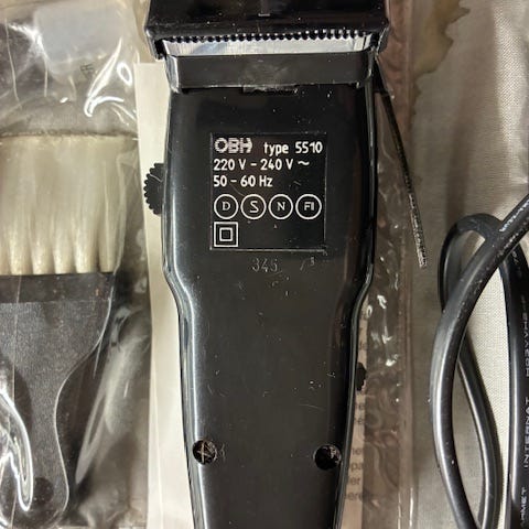 AEG HSM 5545 elektrisk hårtrimmer i sort og orange farve. Enheden har en strømafbryder og justerbar klippeindstilling. Drevet af 600mA DC strømforsyning. Designet til hårklipning med elektrisk drift.