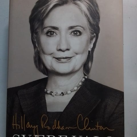 Bog om Hillary Rodham Clinton med sort-hvid forsidebillede og signaturtryk. Indeholder tekst og billeder, der beskriver hendes politiske karriere og livshistorie.