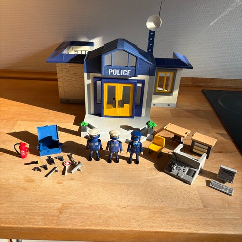 Playmobil politifigurer med tilbehør, herunder tre figurer i forskellige uniformer, en blå kuffert, en hat, en trafik kegle, et 'Road Block' skilt, håndjern, og andre små redskaber. Sættet indeholder også en sammenklappelig afspærringsbom.