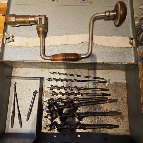 Sæt med forskellige boremaskine bor i en trækasse. Borerne er af metal og varierer i størrelse og type, egnet til forskellige boreopgaver.
