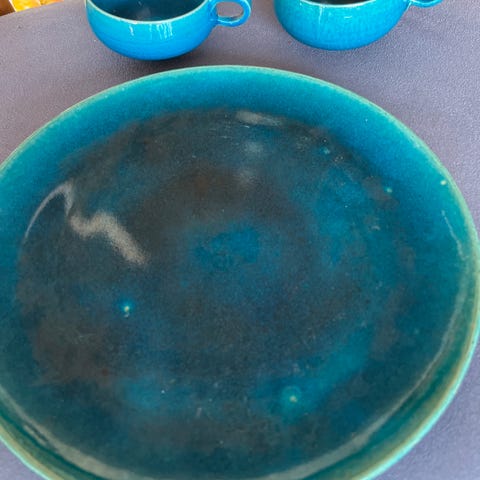 Kähler tallerken i blå turkis glasur i keramik. Tallerkenen har en rund form og en glaseret overflade. Velegnet til brug i køkkenet til servering af mad.