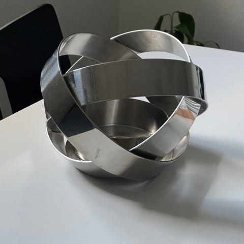 Georg Jensen Living dekorationsskåle i forskellige størrelser. Skålene har et karakteristisk bølget mønster og er lavet af blankt metal. Velegnet til brug som dekorative elementer i hjemmet.