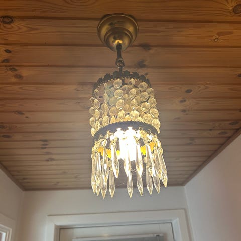 Virkelig smuk vintage lampe, i messing og med glasprismer hele vejen rundt og glas inderskærm. Brugt men i fin stand.