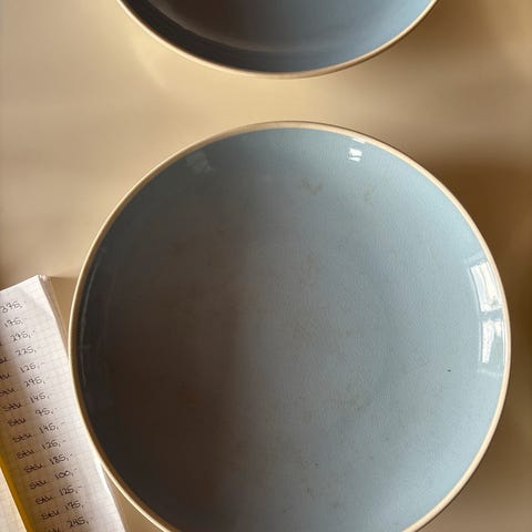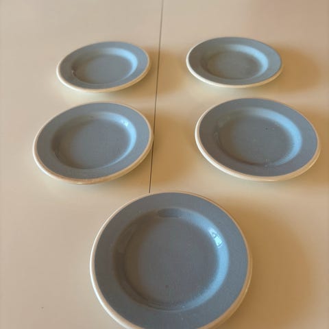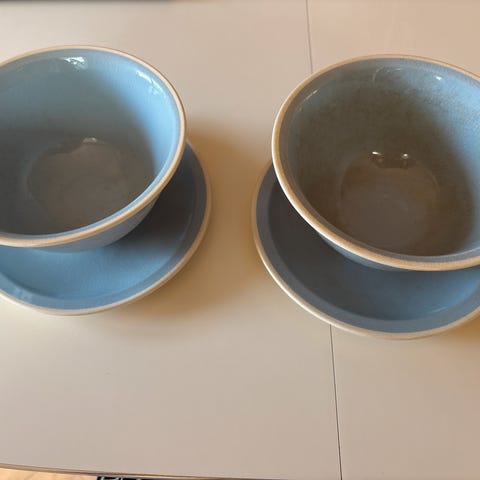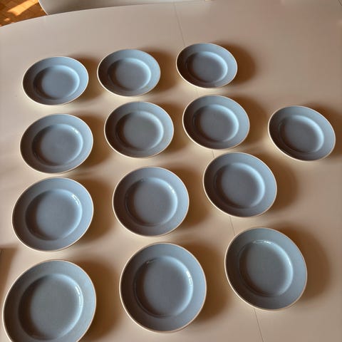 Jeg prøver at sælge dem samlet, men hvis det ik går, ka de købes separat. Der er: 1 stk stor Skål, flade tallerkener, dybe tallerkener, side tallerkener, underkopper og et lille kuvert askebæger☀️jeg håber på at køber henter det hos mig i Hillerød, hvis ikke ska jeg nok sende det😀