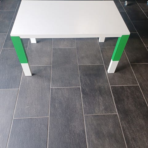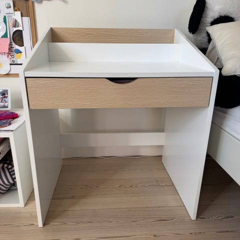 Det er et skrive bord med papir til. God til børn der kan lide at tegne. Man kan ændre på bordets højde.