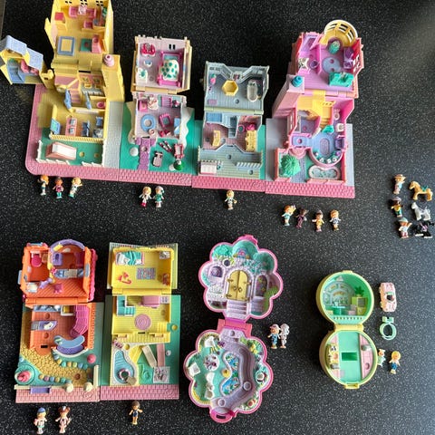 Polly Pocket legetøj i form af en blomst, lavet i plastik med lyseblå farve. Kompakt design med indvendige detaljer og små figurer inkluderet. Velegnet til børn til leg og samling.