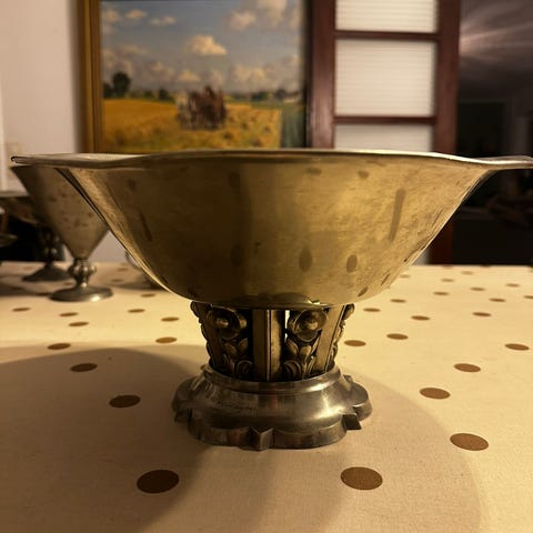 Det modernistiske formsprog kom til Just i halvtredserne. Blandt andet ved at Nanna Ditzel og Henning Koppel formgav for dem.Her i form af et lille stramt designet fad fra Danish Modern perioden. Det er umiskendeligt Koppels stil. MEN JEG ER IKKER SIKKER !!!