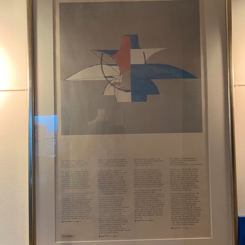 Kunstplakat med motiv af PH5 lampe i farverne rød, blå og hvid. Plakaten har en synlig plet på overfladen. Velegnet til vægophæng som dekorativt element.