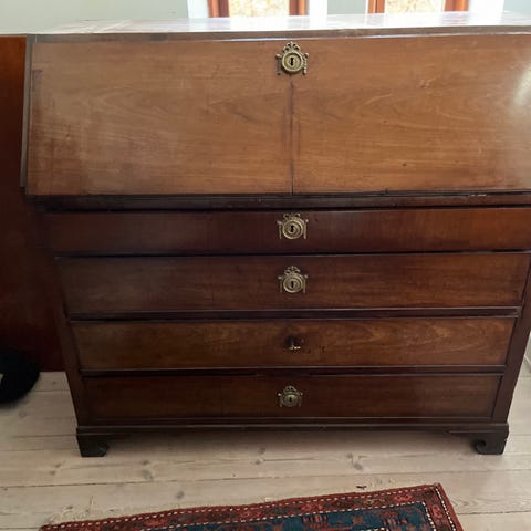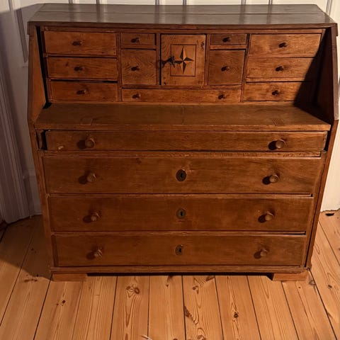Gratis Antikt skrivebord i træ med flere skuffer. Store rummelige skuffer nederst og små skuffer for oven. 1 m høj, 101 cm bred, 46 cm dyb.