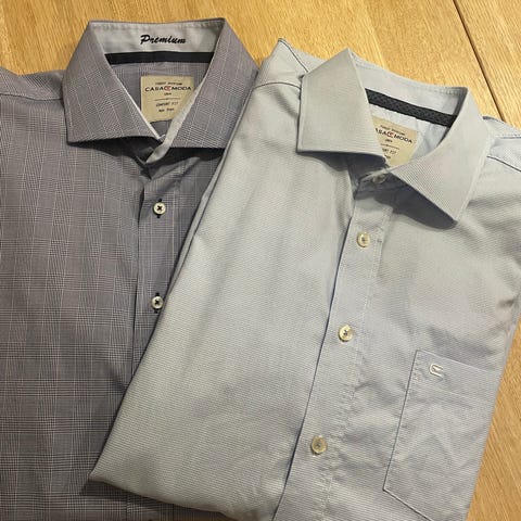 Skjorter i blå nuancer, med rød i den ene. 75 kr per stk og 140 kr for begge.