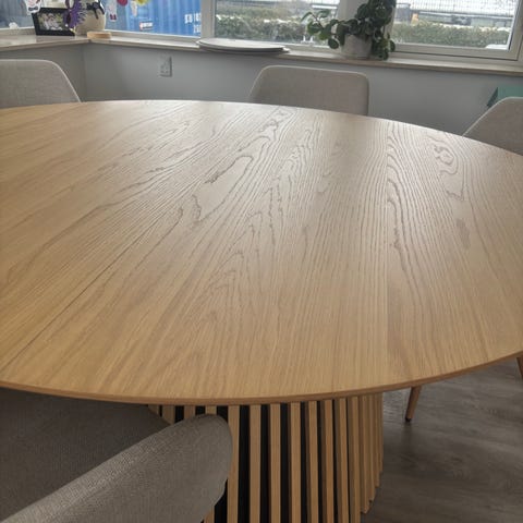 Sort rundt spisebord med bordplade i sort marmor og sort base i bølget massiv eg. Bordet har en solid og robust konstruktion, velegnet til spiseområde eller mødelokale. Som ny. Udstillingsmodel. Nypris 35.000,-